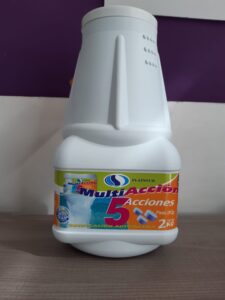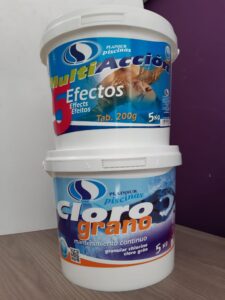 Nuestro cloro Multiacción 5 acciones dispone de un tratamiento completo :Desinfectante – Alguicida – Clarificante – Estabilizador de cloro – Antihongos.